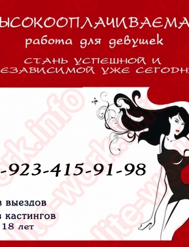 Работа только на апартаментах. Никаких выездов. Никаких ночных смен. Цивилизованно, спокойно, конфиденциально. Работа для девушек 18+. Стоимость часа начинается от 6000 -15000 ...